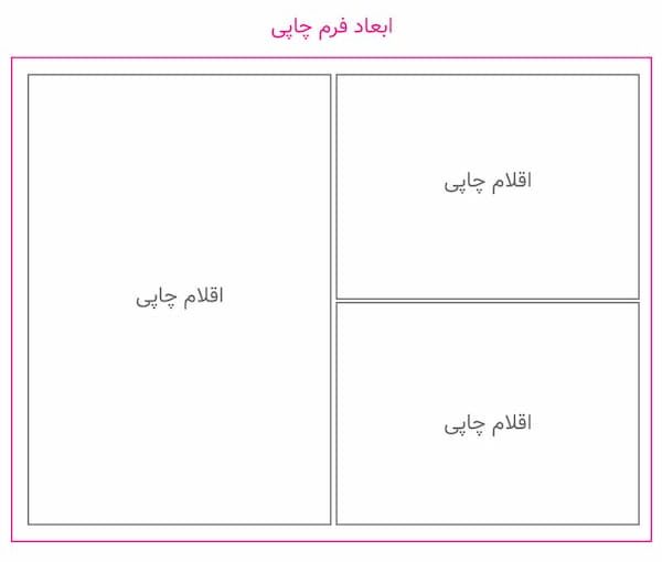 3. دسته سوم: ابعاد فرم چاپی (منظور ابعاد صفحه ای است که فایل طراحی شما را بر روی آن چیدمان می‌کنند تا برای چاپ ارسال شود. دانستن ابعاد فرم چاپی به شما این امکان را خواهد داد تا با محاسبه ابعاد؛ کمترین میزان پرت کاغذ را چاپ داشته باشید.)